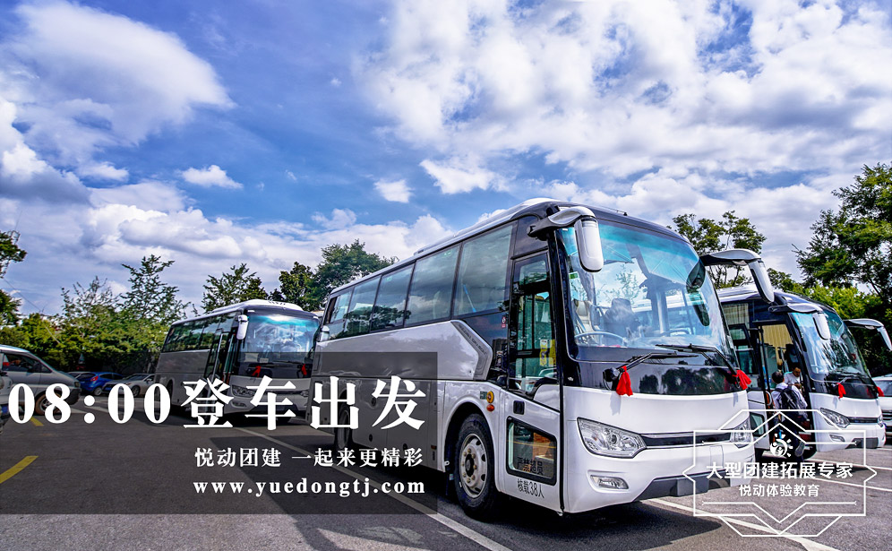 | 08:00悦动团建拓展学院接送大巴车辆到达参训单位楼下集合出发前往拓展基地 |